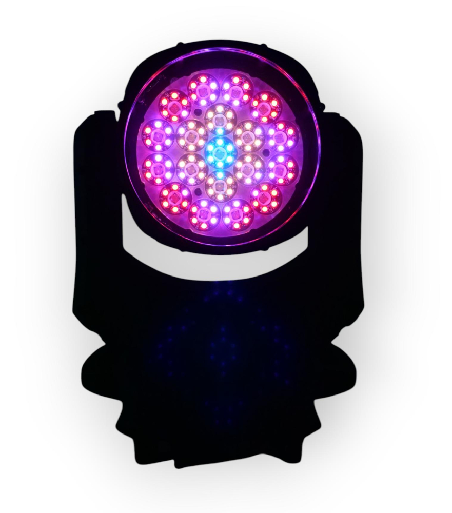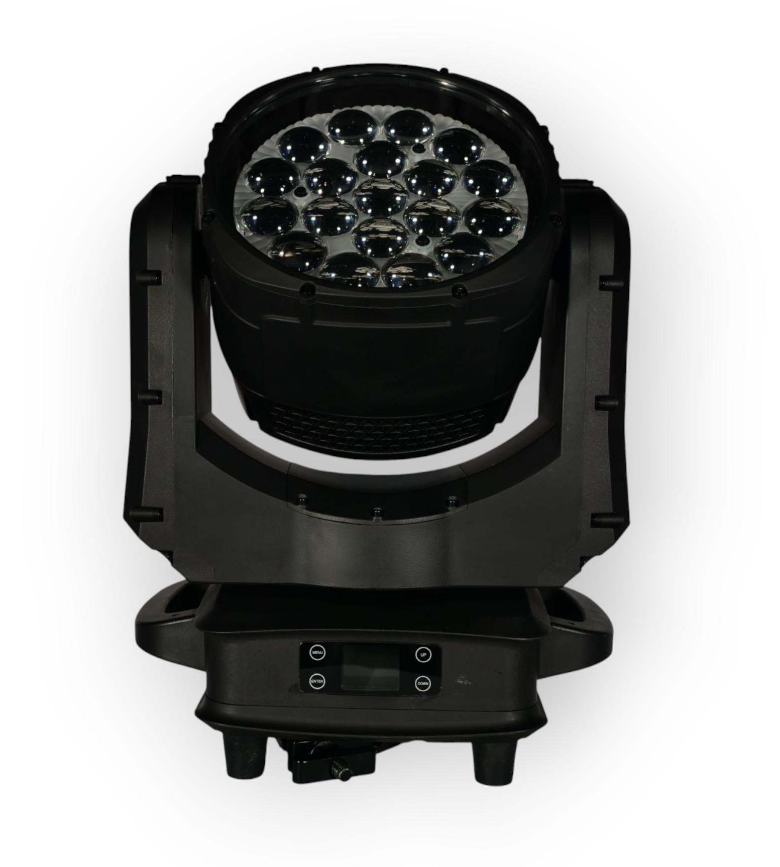 Источник света: 19 × 25 Вт RGBW LED (смешение RGBW) и фронтальная RGB‑матрица 114 × 0,2 Вт. Поддерживается индивидуальное управление пикселями (pixel mapping) для построения динамических рисунков по лицу прибора и зонального контроля светового поля.