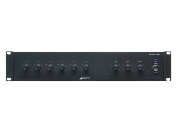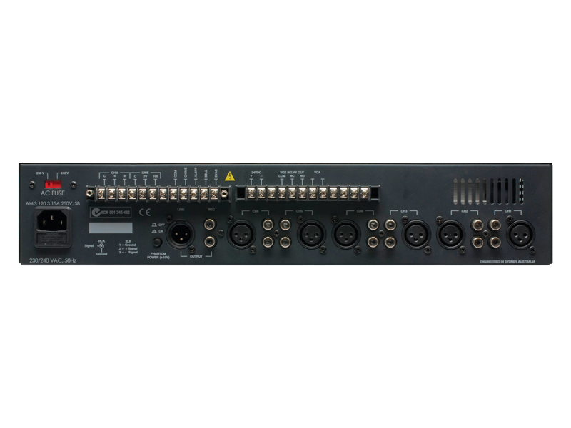 Микшерный усилитель.  120W. 6 x двойные сбалансированные линейные входы. 100V, 70V, 4Ω & 8Ω выходов. 240VAC & 24VDC. 2RU.