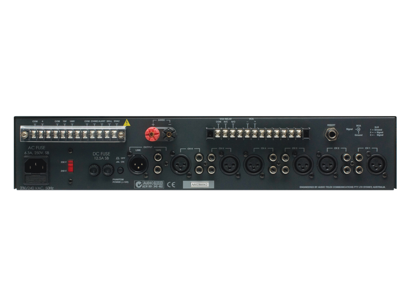 Микшерный усилитель. 250W. 6 x двойных балансных линейных входа. 100V, 70V, 4Ω & 8Ω выходов. 240VAC & 24VDC. 2RU.