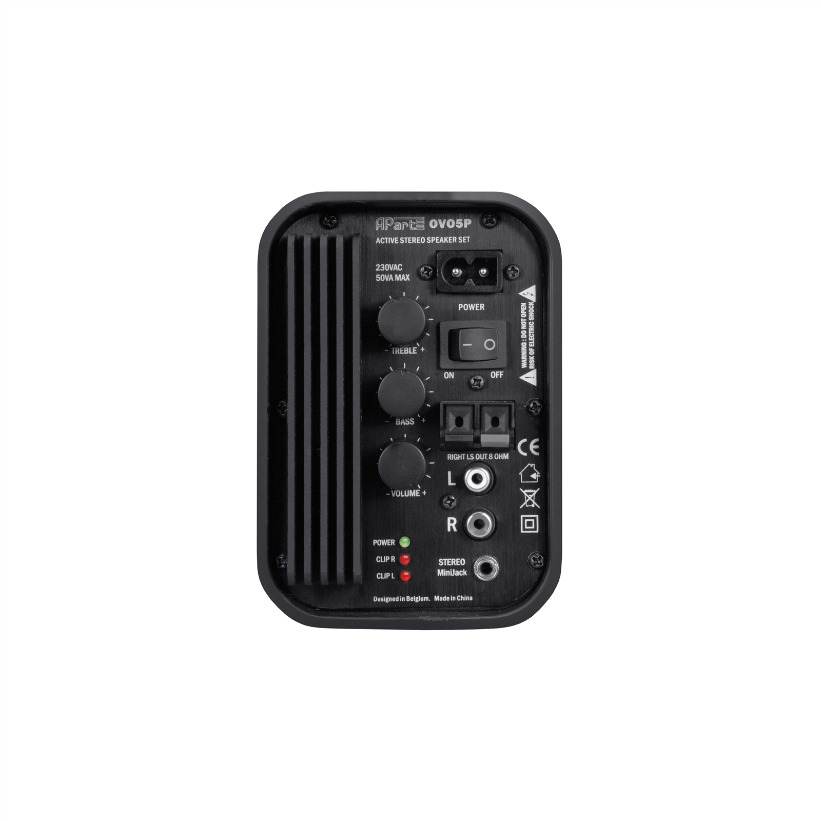 OVO5P имеет НЧ динамик 5 ¼" и 1 "купольный твитер. На задней панели активного громкоговорителя расположены регуляторы НЧ и ВЧ, регулятор уровня громкости.Линейный стерео вход (мини-джек), линейный стерео вход (RCA несимметричный).