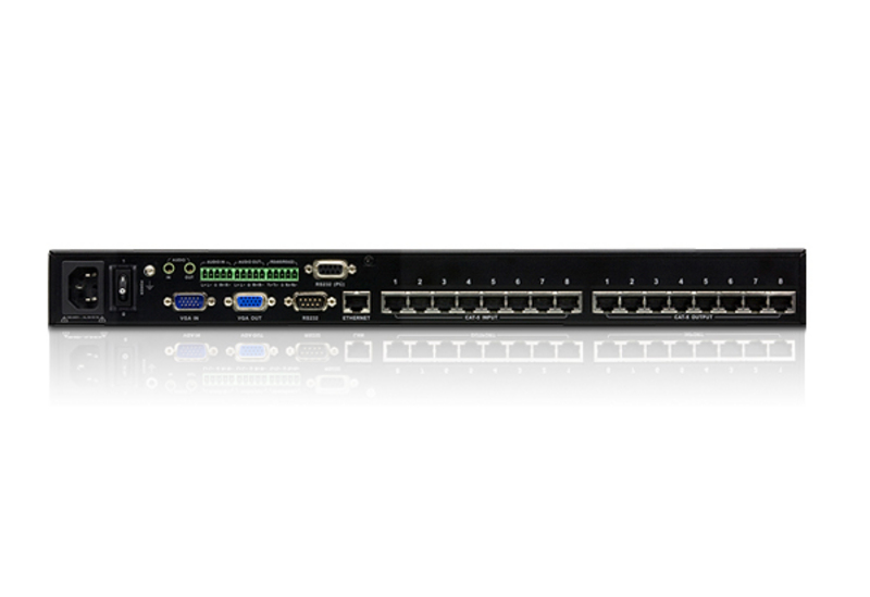 • Подключение любых восьми аудио/видео входов Cat 5 к любым восьми аудио/видео выходам Cat 5 при использовании аудио/видео удлинителя по Cat 5 VE500/VE300 от ATEN