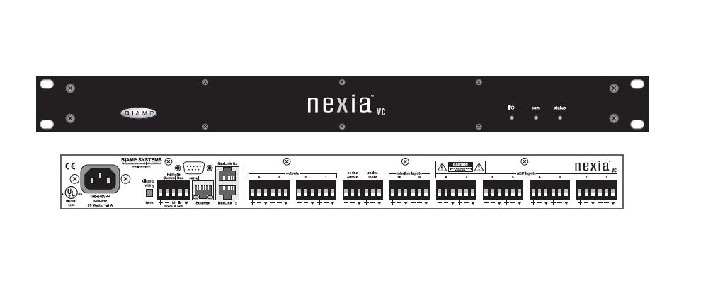 Nexia VC производства Biamp — цифровая платформа для видео конференций. Имеет 8 микрофонных/линейных входов с функцией эхоподавления AEC, 2 стандартных микрофонных/линейных входа, 4 балансных микрофонных/линейных выхода, интерфейс кодека ВКС с балансными линейными входом и выходом.
