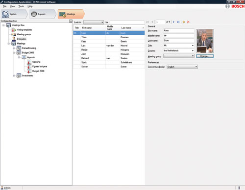 Вся информация вводится при помощи конфигурационного приложения до начала или во время конференции. Для каждого участника конференции можно задать значительный объем данных. Все сведения об участниках, например, имя участника, страна, группа и язык, могут быть использованы повторно и не нуждаются в повторном вводе для каждого совещания. При подготовке совещания имеется возможность предоставить отдельным участникам определенного совещания доступ к микрофонам, голосованию (или отказать в таком доступе), а также определить вес голоса.