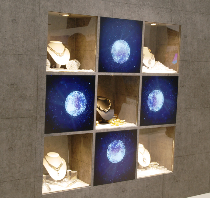 Бесшовный ЖК дисплей, общий межпанельный шов 5,9 мм, встроенный контроллер, диагональ 21,6”, 960х960 пикс., яркость 450 кд/м2, угол обзора 178 град., размер 393.3 х 393.3 х 100.3 мм