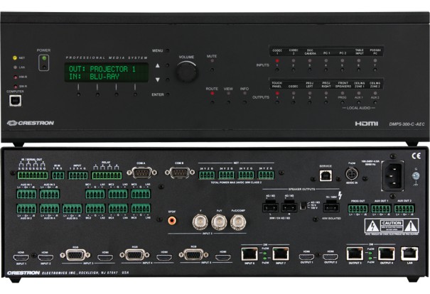 Система Crestron® DMPS-300-C-AEC — это комплексное решение для управления презентациями высокого разрешения и маршрутизации сигналов, предназначенное для установки в залах заседаний и комнатах для видеоконференций. DMPS-300-C-AEC представляет собой стоечный модуль высотой 3U с интегрированной системой управления, мультимедийным матричным коммутатором, микрофонным микшером, оснащенным функцией эхоподавления, блоком цифровой обработки аудиосигнала и усилителем. Такое решение обеспечивает гибкую маршрутизацию сигналов и высокую производительность их обработки, избавляя от необходимости в дополнительных компонентах. Все входы конфигурируются автоматически и работают по принципу Plug-and-Play, обеспечивая совместимость с широким спектром цифровых и аналоговых источников сигнала. Встроенная поддержка DigitalMedia и HDBaseT позволяет применить эффективное решение для кабельного подключения к удаленным источникам аудиовидеосигналов, компьютерам и дисплеям.