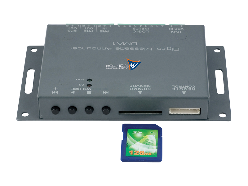Цифровой диктор сообщений. Поставляется с картой памяти 512 Мб (поддержка до 1 Гб). Воспроизведение mp3 файлов, на борту Play, FF, REW и возможность дистанционной остановки. Возможность закрытия воспроизведения повторных триггерных файлов, RS485