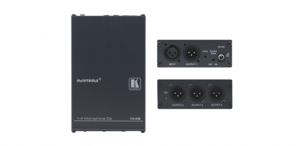 Kramer 104B — высококачественный усилитель-распределитель 1:4 для балансного монофонического аудиосигнала, получаемого от микрофонов с разъемами XLR. Сигнал с единственного входа прибора распределяется на четыре одинаковых выхода.
