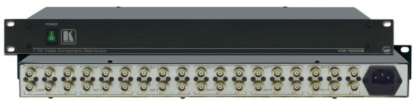 Kramer VM-100CB — высококачественный усилитель-распределитель 1:10 для компонентного видеосигнала (совместимый с HDTV). Он распределяет сигнал, поступающий на единственный вход, на 10 идентичных выходов (используются разъемы BNC). Полоса частот составляет 450 MГц, поэтому усилитель-распределитель «прозрачен» для сигнала даже при работе на самых высоких разрешениях. Проходной выход используется для подключения местного монитора (или другого приемника, работающего с компонентным сигналом) или для построения более крупных систем распределения видеосигнала. Подстроечными регуляторами, расположенными на дне прибора, настраиваются уровни сигналов YUV и компенсация АЧХ кабеля. VM-100CB выполнен в корпусе 19" 1U для установки в стойку и питается от сети переменного тока 100-264 В, 50/60 Гц.