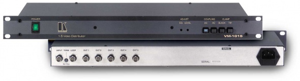 Kramer VM-1015 - многофункциональный видеоусилитель-распределитель 1:5 вещательного качества. Распределяет входной сигнал на пять идентичных выходов. Входы могут быть открытого или закрытого типа с привязкой к уровню черного или к уровню синхросигнала, что позволяет работать со всеми форматами видео.