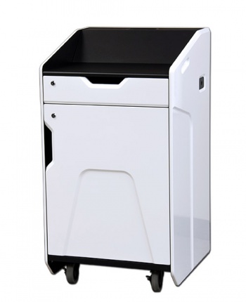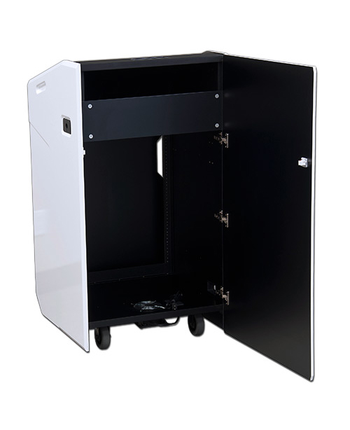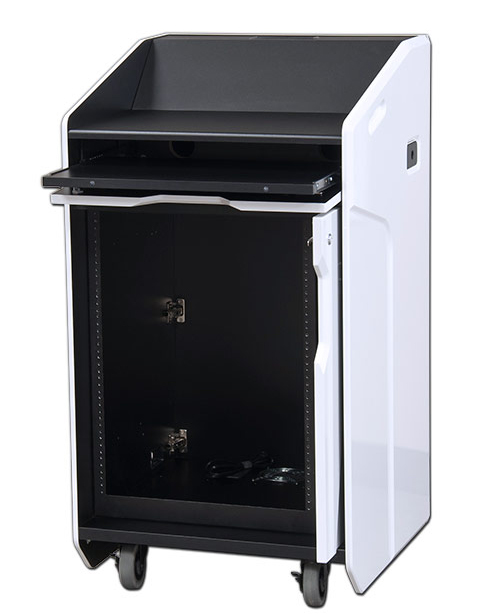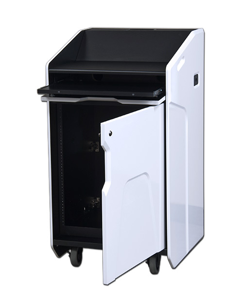 Мультимедийная мобильная кафедра LEX30 - имеется пространство для рэковой стойки высотой 14 RU и возможность установки двух откидных полок. Достойный внешний вид задней части, обращенной к аудитории. Скрытая задняя дверца, обеспечивающая свободный доступ к оборудованию. Запирающаяся передняя дверь, выдвижная полка для клавиатуры, лоток для мыши, усиленные колеса 10 см на шарикоподшипниках.