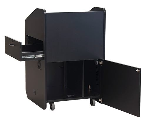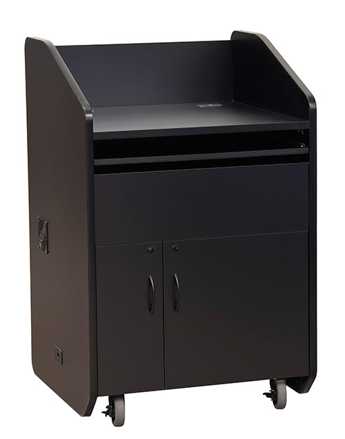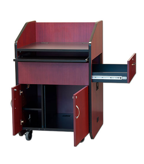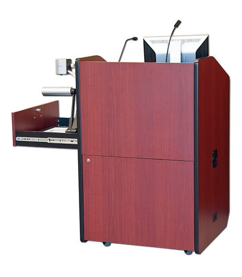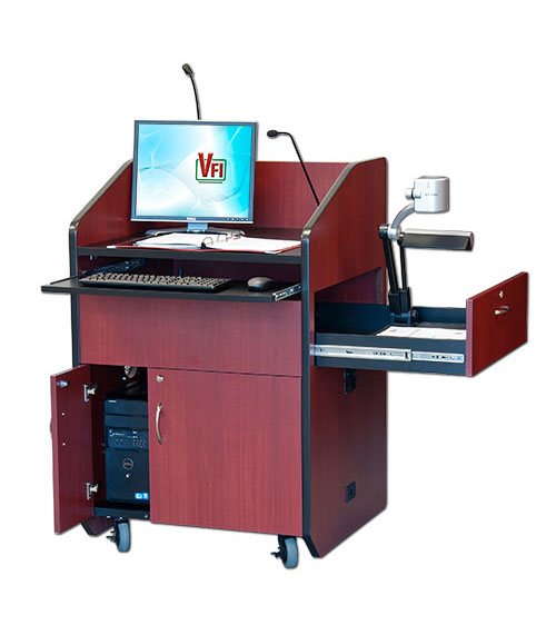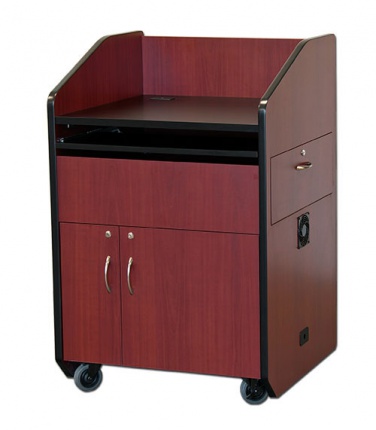 Передвижная бюджетная кафедра модели PD3006 - компактная версия популярных мультимедийных презентационных кафедр. Для уменьшения общего размера, эта модель имеет выдвижную боковую полку для документ-камер и открытую полку для клавиатуры. В запираемом нижнем отделении установлена стандартная рэковая стойка высотой 10RU. Запираемые дверцы на фронтальной и тыльной сторонах кафедры обеспечивают удобную подводку кабелей к тыльной стороне рэковой стойки. Трибуна имеет цвета под дерево или однотонные цвета, которые, несомненно, подойдут к любой обстановке в помещении для презентаций.