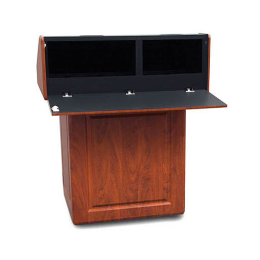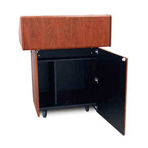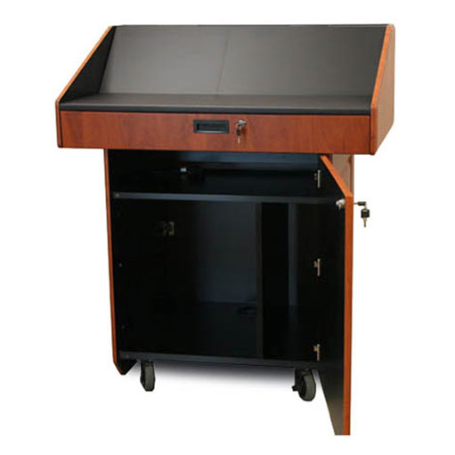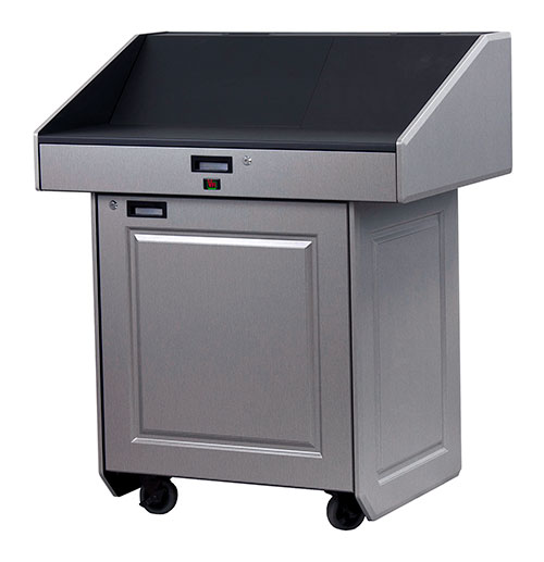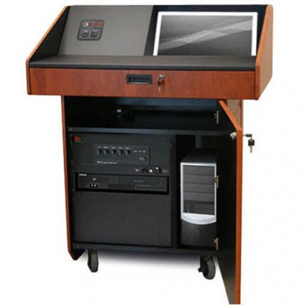 Мультимедийная мобильная кафедра PDX22 - многофункциональная мультимедийная мобильная кафедра с большой рабочей поверхностью и компактным основанием для размещения оборудования. Внутренняя стандартная рэковая стойка высотой12RU, пользовательская консоль, двери с замком, ролики с блокировкой.