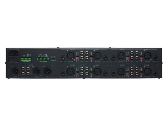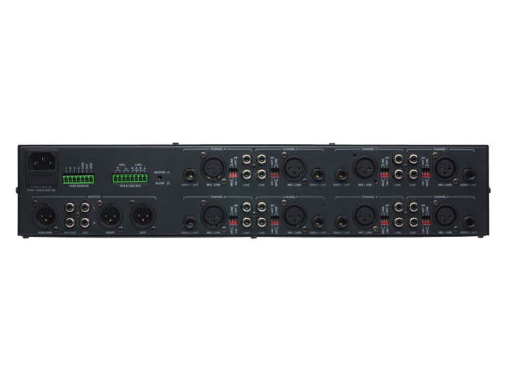 Микшер. 8 стерео или XLR-балансными входами. Индивидуально переключаемое фантомное питание, интервал подстройки усиления: +/- 15dB, вход XLR переключаемый между микрофонными / линейными уровнями, стерео RCA вход, прямой выход линейного уровня