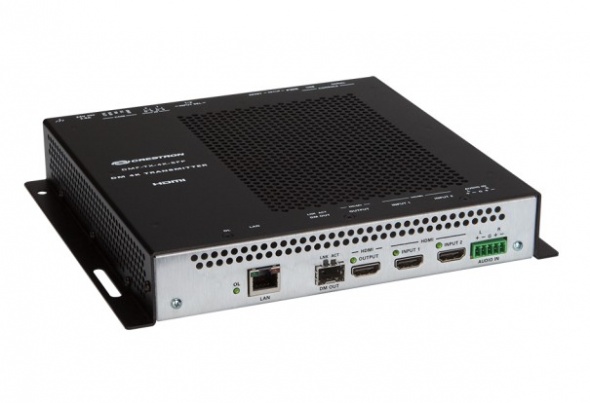 DMF-TX-4K-SFP является передатчиком сигнала по оптоволокну, созданный как составная часть решения Crestron® по удлинению 4K видеосигнала. Он используется в паре с приемником (DMF-RMC-4K-SFP или DMCF-RX-4K-SFP [1]) в качестве удлинения сигнала точка-точка и может быть использован для добавления возможности ввода 4K по оптоволокну для коммутатора DigitalMedia™ (ознакомьтесь с разделом “Интеграция с коммутатором DM®” ниже по тексту). Его порт “DM OUT” допускает установку соответствующего приемопередающего модуля SFP+ для обеспечения совместимости с одномодовым или многомодовым оптоволокном [2]. Он так же оснащен двумя входами HDMI®, входом аналогового звука, местным HDMI выходом, управляющими портами ИК и RS-232 и ЛВС портом Gigabit Ethernet. Благодаря компактному, тонкому дизайну, DMF-TX-4K-SFP можно скрыто разместить за плоскопанельным дисплеем, над потолочным проектором, под столом или внутри трибуны.