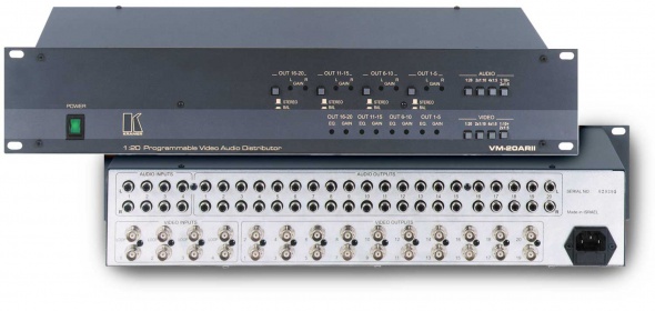 Распределитель, усилитель композитных видео и звуковых стереосигналов 1:20. Он принимает 1 входной сигнал и распределяет его на 20 идентичных выходов. Для видео используются разъемы BNC; для звука - разъемы RCA. Устройство может работать как 2 раздельных усилителя, распределителя 1:10 или четыре 1:5. Кроме того, можно использовать его как один УР 1:10 плюс два 1:5.