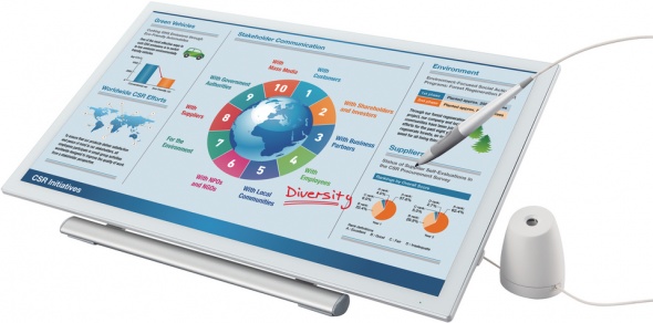 Емкостной-сенсорный ЖК-монитор Sharp с диагональю 20", 10-точечным мультисенсорным экраном и функцией ввода при помощи цифрового пера открывает пути для поиска новых подходов в работе. LL-P202V отличается чрезвычайно быстрым откликом на рукописный ввод и прикосновения и воспроизводит изображения с разрешением full HD (1920 x 1080).