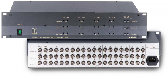 VM-54 – видеоусилитель, распределитель 1:54 композитных сигналов. Может работать как одиночный видеоусилитель, распределитель 1:54 компонентных сигналов либо как три раздельных видеоусилителя, распределителя 1:18 компонентных сигналов с проходными гнездами. Для работы в режиме 1:54 необходимо, чтобы все три канала 1:18 были связаны через проходные гнезда с помощью коротких кабелей. VM-54 совместим с видеоусилителем, распределителем звуковых сигналов VM-54А, который также имеет два режима – 3х1:18 и 1:54.