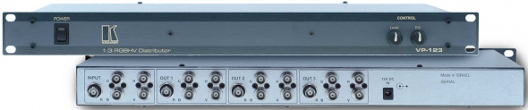 Kramer VP-123 и VP-123V — высококачественные распределители, усилители 1:3, предназначенные для работы с графикой и компонентным видео. Оба прибора снабжены пятью разъемами BNC для каждого выхода. В устройстве VP-123 используются также 5 разъемов BNC для входных сигналов, в VP-123V применен входной разъем VGA HD15F. VP-123/V снабжены тремя широкополосными аналоговыми каналами red (красным), green (зелёным) и blue (синим), которые можно при необходимости использовать для работы с другими форматами, такими, как композитный сигнал, Y/C, компонентное видео и т.д. Два остальных канала предназначены для сигналов горизонтальной и вертикальной синхронизации; это логические/цифровые каналы, для них применяется специальная схема для восстановления синхронизации и формирования импульсов. В дополнение к задачам обработки сигналов RGBHV, каждый из трех аналоговых каналов может работать независимо от других, позволяя применять устройство в качестве трех отдельных распределитель, усилитель 1:3 композитного видео или других форматов. Полоса пропускания 450 МГц обеспечивает прозрачность работы VP-123V даже в жестких широковещательных условиях или в случае обработки изображений высокой четкости. Устройства выполнены в прочном, профессиональном корпусе, занимающем только один вертикальный отсек стандартной стойки 19”. Напряжение питания устройств — постоянный ток 12 В, это делает их идеально подходящими также и для эксплуатации в полевых условиях.
