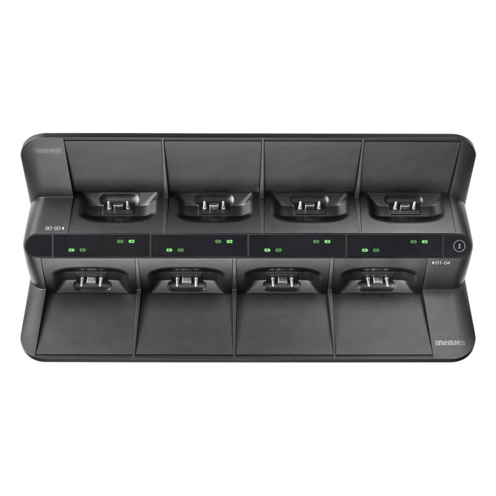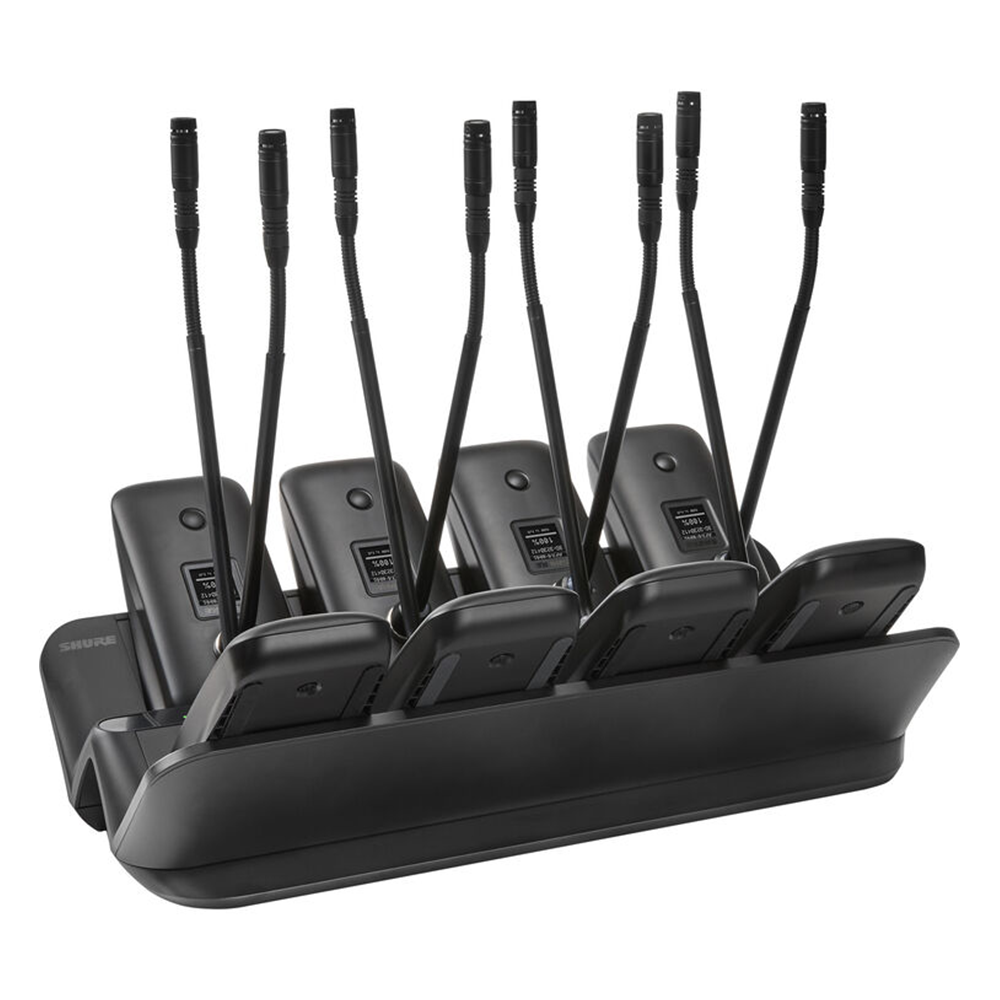 Shure MXWNDX8G — сетевая док-станция, позволяющая заряжать 8 передатчиков MXW neXt без извлечения батареи. Совместима только с передатчиками MXW neXt с гибким штативом.