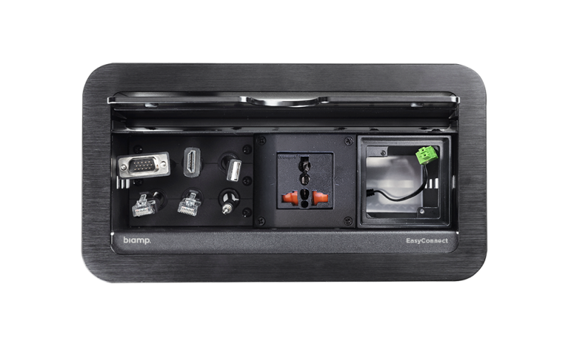 Biamp EasyConnect EC-PKP-EU — это система для организации кабельной продукции на столе, предназначенное для решения задач, связанных с отсутствием или слишком короткой длиной необходимых кабелей, а также отсутствием или неудобным расположением розеток питания. EasyConnect помимо прочего предполагает упорядоченную аккуратную прокладку кабелей, вместо привычного беспорядка на полу. EasyConnect EC-PKP-EU может быть собран в различных комбинациях с панелями управления или без них. Наличие панели управления, установленной на столе, делает управление AV-оборудованием более быстрым и эффективным.