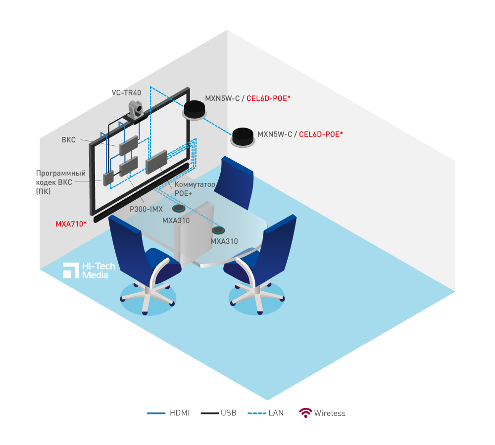Акустические системы могут быть выбраны исходя из дизайна помещения с возможностью выбора из Taverlab CEL6D-POE и Shure MXN5W (требуется POE).
