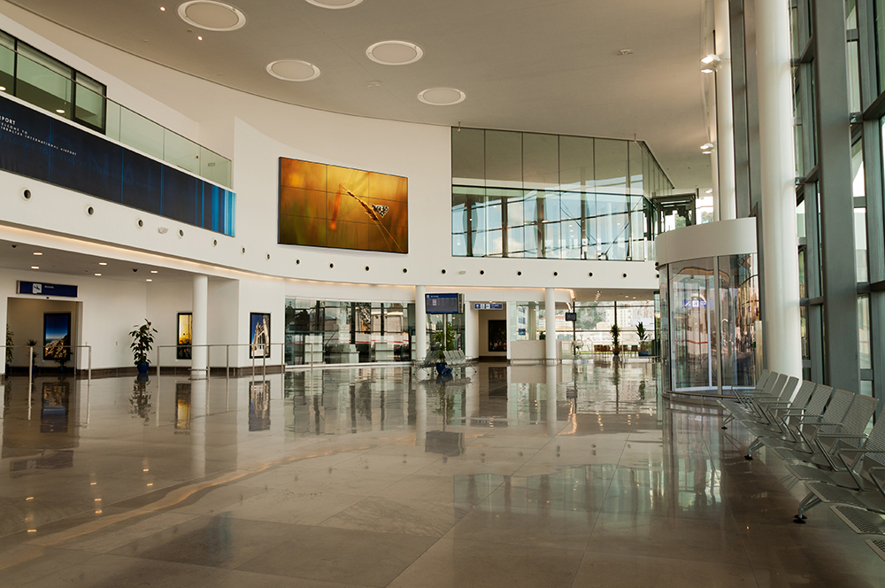 Бесшовная видеостена 3х3 из девяти ЖК-дисплеев LG 49VL5G рекомендуется для использования в конференц-залах, холлах, диспетчерских пунктах, ситуационных центрах, в качестве системы отображения информации коллективного пользования, в торговых залах, на вокзалах, в аэропортах и других помещениях в качестве систем Digital Signage.