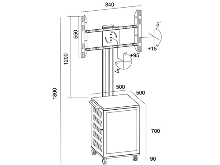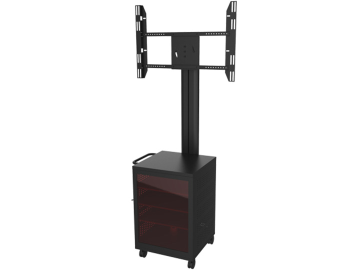 - M7761 (7350022737761) - Мобильная стойка для ЖК-панели 40-60", VESA 800x400, -5°+15°, до 60кг, портретная/альбомная, с закрытой стойкой под оборудование (три полки), 4xSchuko, алюминий, черный