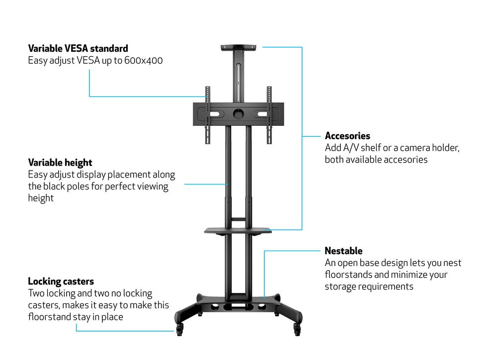 Простая регулировка высоты экрана и мобильность означают, что оптимальная позиция просмотра всегда может быть достигнута для любой презентации, цифровой рекламы или видеоконференции. Колеса для тяжелых условий эксплуатации снабжены предохранительным тормозом, благодаря которому подставка не может сместиться с места, а встроенная система прокладки кабелей обеспечивает аккуратный и профессиональный вид.
