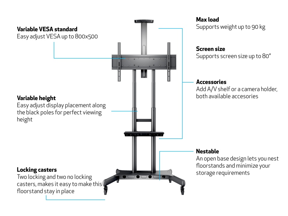 Простая регулировка высоты экрана и мобильность означают, что оптимальная позиция просмотра всегда может быть достигнута для любой презентации, цифровой рекламы или видеоконференции. Колеса для тяжелых условий эксплуатации снабжены предохранительным тормозом, благодаря которому подставка не может сместиться с места, а встроенная система прокладки кабелей обеспечивает аккуратный и профессиональный вид.