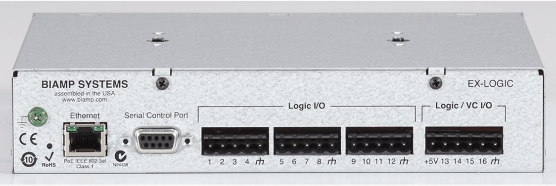 Tesira EX-LOGIC производства Biamp — модуль логических входов/выходов. Используется с Tesira SERVER и SERVER-IO, TesiraFORTÉ (с/без AVB). Блок обеспечивает 16 логических контактов (входов/выходов), может быть представлен как блок управления в ПО Tesira. 12 логических контактов предназначены только для логических соединений (замыкание контактов или 5 В для входа, до 40 В / 500 мА для выхода).