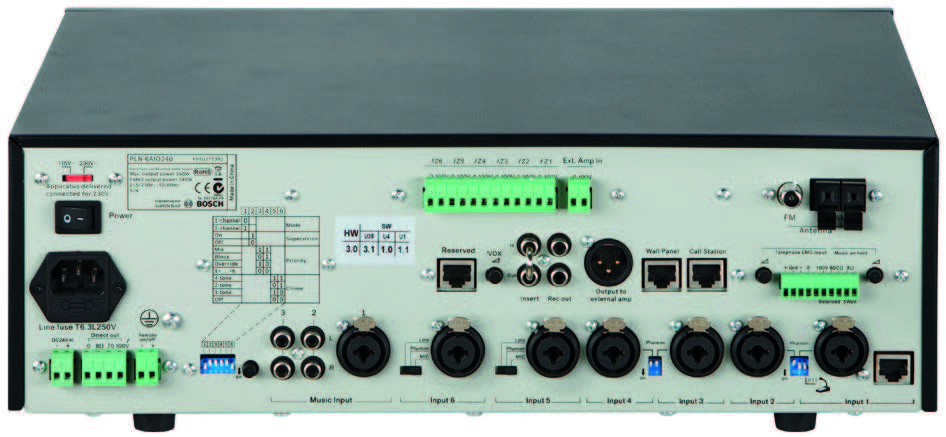 Система PLN-6AIO240 снабжена шестью входами, для которых имеется возможность переключения уровня чувствительности между микрофонным и линейным уровнем сигнала. Вход 1 также принимает дополнительную вызывную станцию коллективных вызовов (PLE-1CS или PLE-1SCS). Балансировка входов выполняется, но они могут использоваться и без нее.