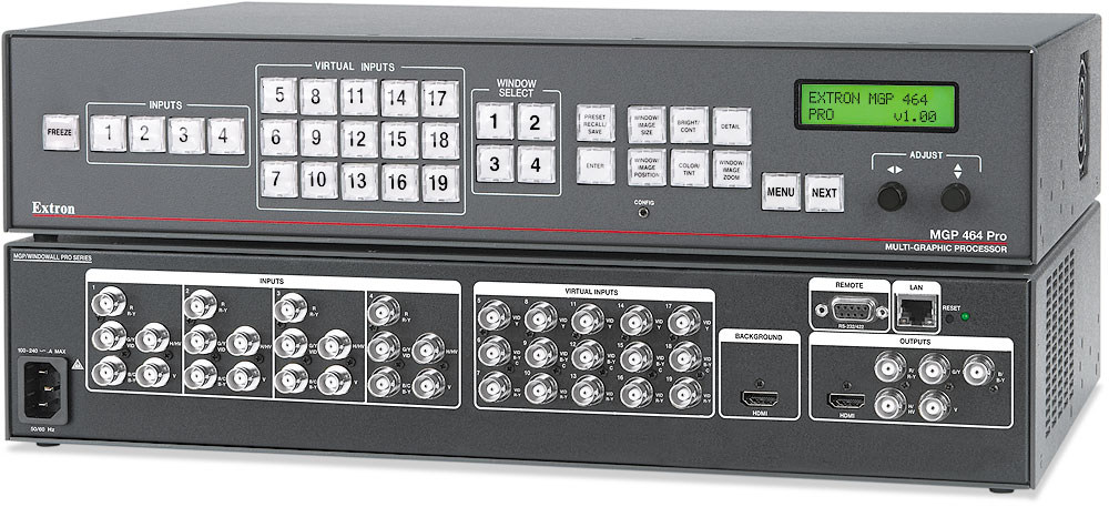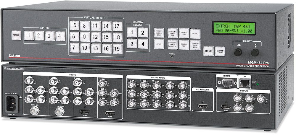 Обеспечивается поддержка широкого ряда входных источников, включая HDMI, компьютерное видео с разрешением 1920x1200, композитное видео, HDTV 1080p/60 и 2K. MGP 464 Pro также выпускается с входами HDMI и 3G‑SDI/HD‑SDI в качестве опции. Встроенный матричный коммутатор на входах и множество высокопроизводительных видеоскалеров позволяют скалировать любые доступные входы в количестве до 19 и выводить их в четырёх окнах для отображения в режиме «картинка в картинке» (PIP). Дополнительно MGP 464 Pro выводит сигналы с различными разрешениями по выбору, включая как компьютерное видео 1920x1200, HDTV 1080p/60 и 2K, так и аналоговое RGB или компонентное видео, в том числе HDMI.