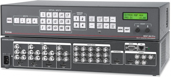MGP 464 Pro предлагает полнофункциональный интерфейс управления на передней панели для понятного и удобного как для интегратора, так и для пользователя доступа ко всем функциям. Удалённое управление MGP 464 Pro может осуществляться по RS‑232 с помощью SIS™ от Extron, набора базовых команд «Simple Instruction Set». Возможность управления по Ethernet обеспечивает удалённый контроль и поддержку с любого компьютера с веб‑браузером. Дополнительно, входящая в комплект программа управления на базе Windows® обеспечивает полную функциональность MGP 464 Pro в реальном времени. Это программное обеспечение осуществляет управление всеми функциями и вариантами конфигурации, включая регулировку положения и размера окон, настройку виртуальных входов видео, в том числе включая накопитель Graphic Still Store.