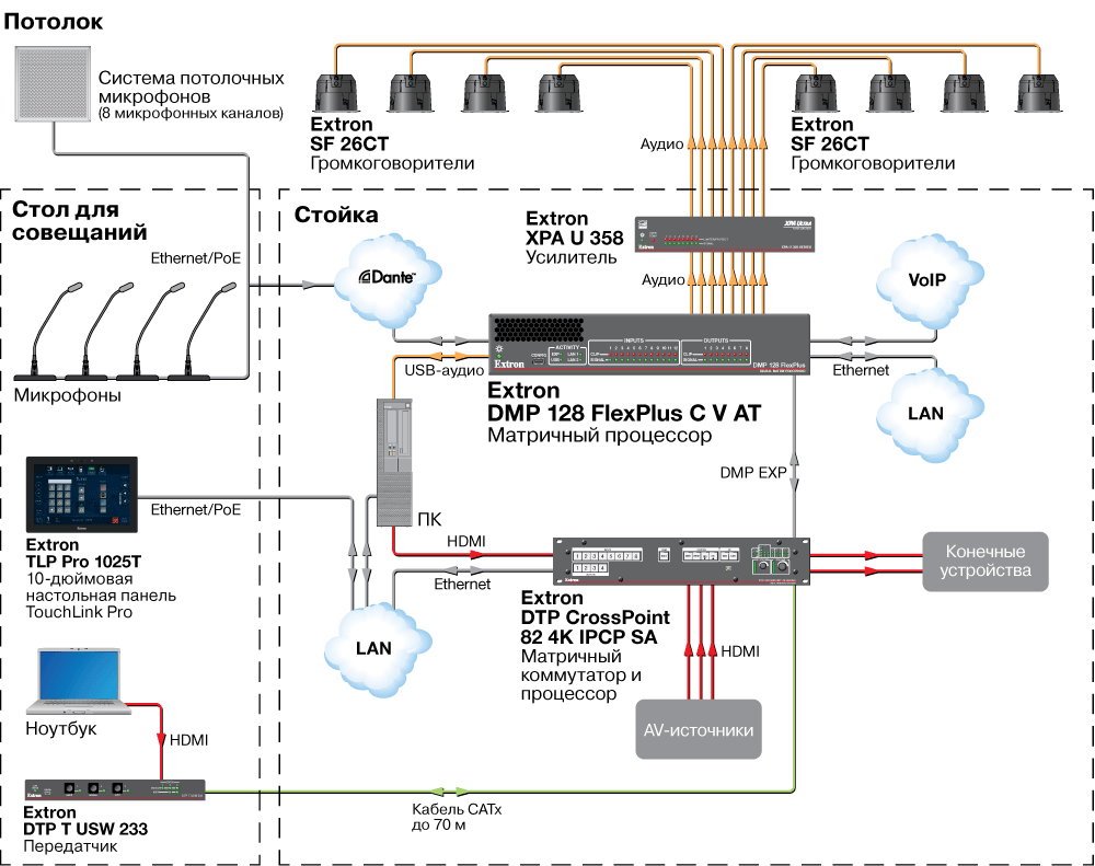 - Тройная матричная конструкция обеспечивает возможность микширования выходов, использования виртуальной обработки и сигналов с шины расширения — тройная матричная конструкция DMP 128 FlexPlus предоставляет существенную гибкость маршрутизации, микширования и обработки входных аудиоисточников. Основная схема коммутации выходов позволяет любому входу микшироваться в любой или на все выходы. При необходимости любой из входов может сначала быть направлен в виртуальную схему коммутации, которая распределяет входы к восьми виртуальным шинам, прежде чем выполнить обратное микширование в выходную матрицу. Виртуальные шины позволяют обрабатывать входы в виде единой группы. Расширенная матрица позволяет обеспечивать маршрутизацию сигнала из шины расширения между DMP 128 FlexPlus и другим процессором DMP или матричным коммутатором DTP CrossPoint от Extron. Расширенная матрица также используется для распределения и получения аудио из сети Dante.