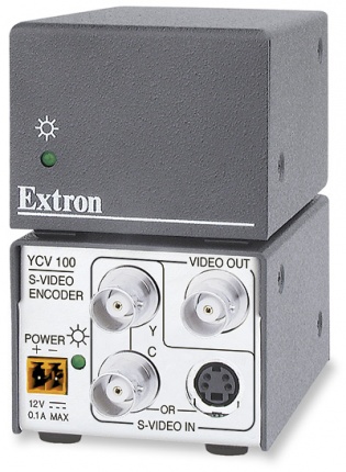 Кодер композитного видео в S-Видео Extron YCV 100 - высококачественное, экономически эффективное решение по преобразованию сигнала серии VersaTools® Это кодер S-Видео в композитное видео, принимающий S-Видео на 4-контактный разъем mini DIN или два разъема BNC-F для сигналов яркости и цветности, преобразующий их и выводящий композитный видеосигнал на разъем BNC-F.