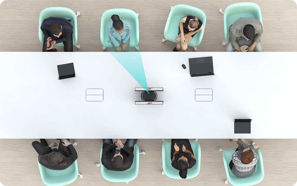 Видеокамера с автотрекингом обеспечивает съёмку в разрешении 4K с панорамным 360-градусным обзором с помощью двух объективов типа «рыбий глаз». Благодаря алгоритму обнаружения движения AI докладчик отслеживается и его изображение автоматически кадрируется. Нет необходимости сидеть неподвижно перед камерой, спикер может встать и ходить вокруг, чтобы провести презентацию.