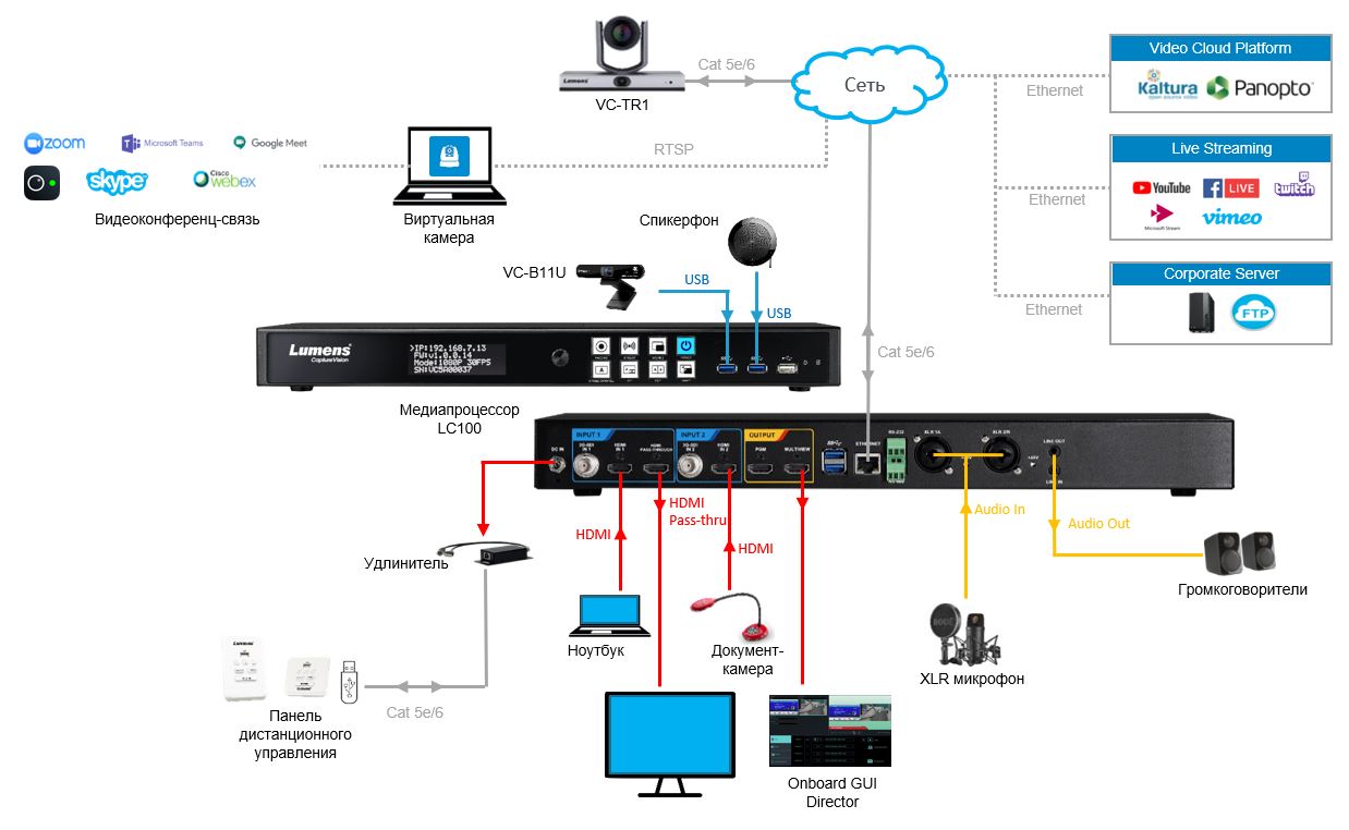 | IP источник / USB камера | Lumens IP поворотная / корпусная камера RTSP источник (H.264 1080p 60/30fps) USB камера (MJPEG 1080p 30fps) |