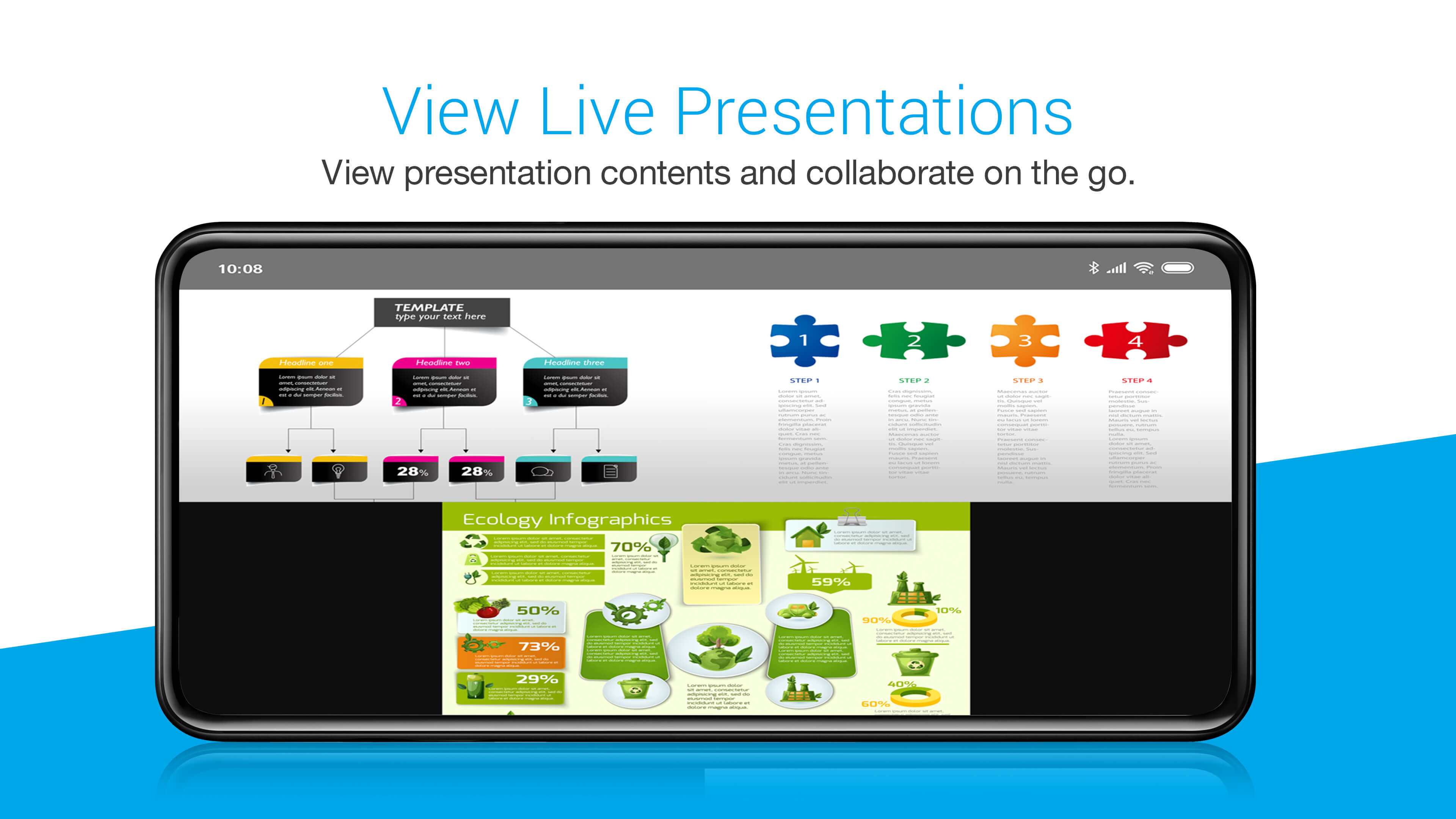 С легкостью транслируйте материалы презентации с Вашего мобильного устройства или используйте режим «прямого эфира» («Go Live»), чтобы материалами могли пользоваться участники встречи, находящиеся в других местах.