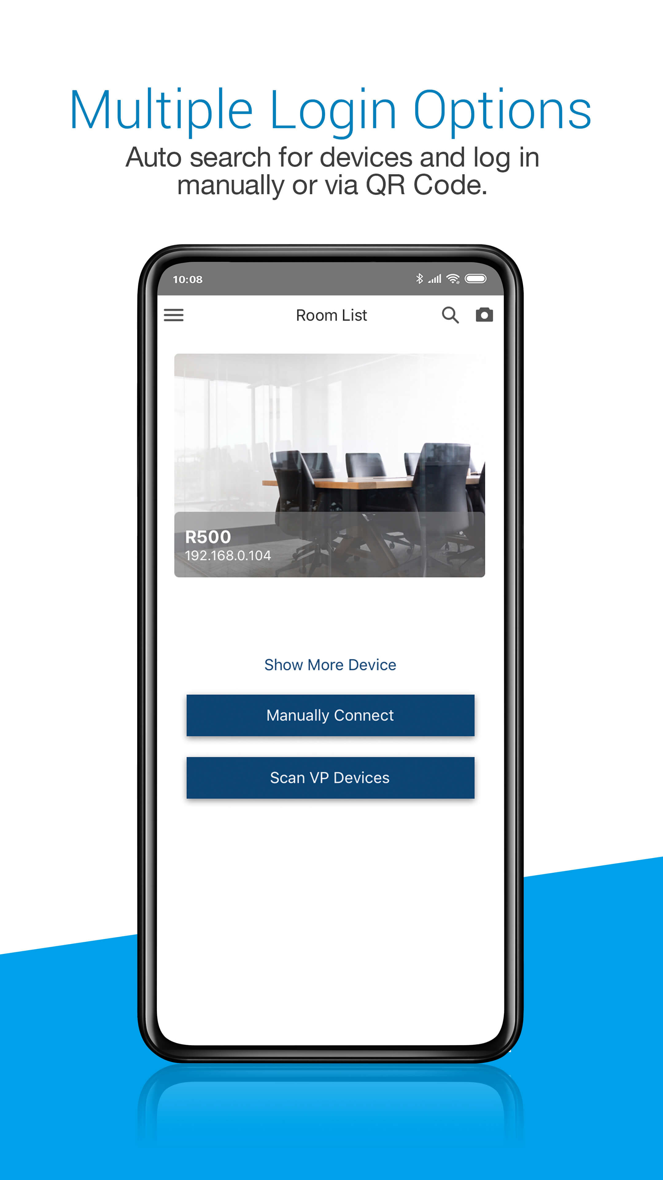 Вход в систему может быть выполнен с помощью автоматического поиска в сети и последующим щелчком по устройству. Возможно подключение вручную, вводом IP-адреса и кода помещения, либо просто отсканировав или загрузив, предварительно сохраненный QR-код устройства для получения мгновенного доступа.