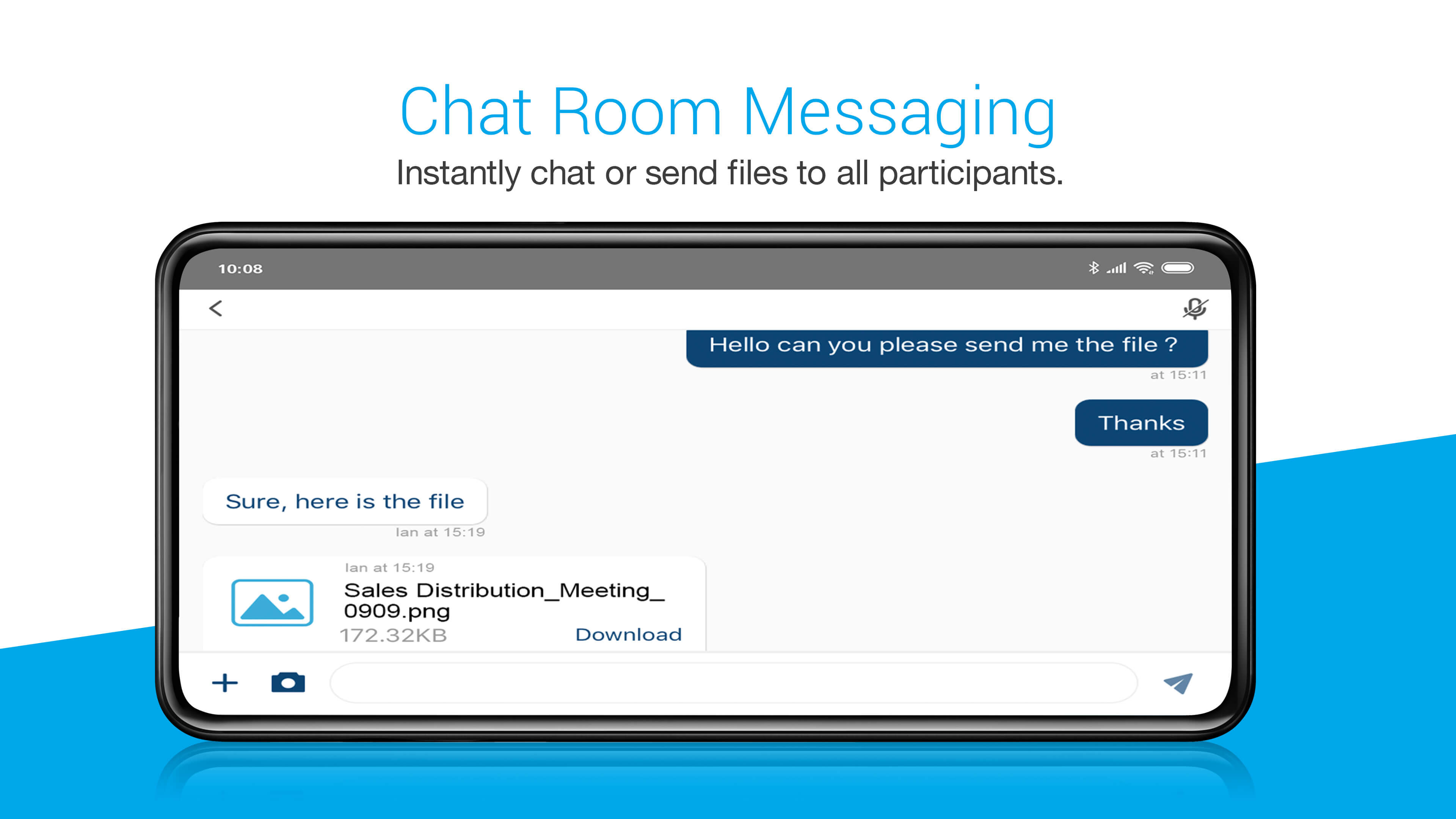 - Функция обмена сообщениями (Chat Room) позволяет участникам встречи общаться друг с другом или мгновенно отправлять файлы.