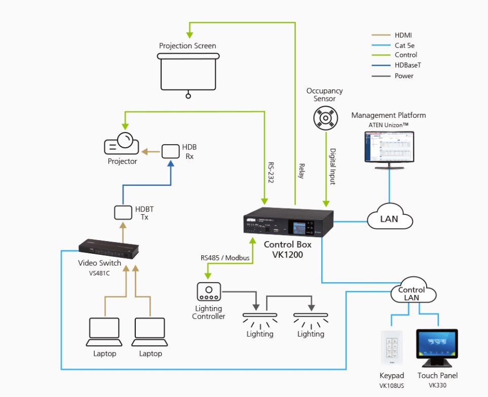 Контроллер VK1200 входит в линейку продуктов системы управления оборудованием компании ATEN, являющейся стандартной системой управления на основе Ethernet-подключения. Она состоит из аппаратного обеспечения, конфигурационного программного обеспечения, интерфейсов управления и связанных с ними сервисов для управления любым аппаратным и программным обеспечением, расположенным в помещении - например, в залах заседаний и аудиториях. И позволяет без особых усилий обеспечить прямое централизованное управление при использовании определяемого пользователем графического интерфейса с помощью любого мобильного устройства, кнопочной и сенсорной панели компании ATEN.