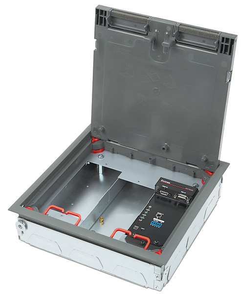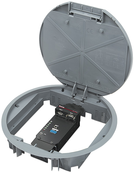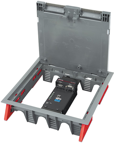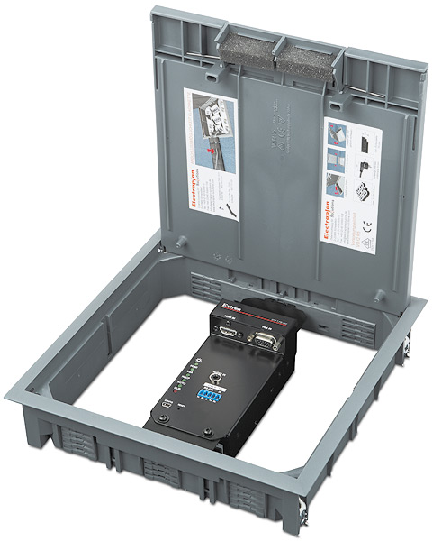 - Спроектирован для монтажа в различные типы напольных лючков — уникальный форм-фактор обеспечивает гибкое монтажное решение с установкой в напольные лючки, предлагаемые OBO Bettermann со слотами GB2 и GB3, MK от Honeywell, Electraplan и PUK.