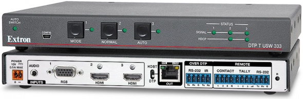 DTP T USW 333 – это коммутатор Extron с тремя входами для передачи HDMI или аналогового видео, аудио, а также сигналов управления устройствам Extron с поддержкой DTP® 330 по экранированному кабелю CATx на расстояние до 100 м. Устройство совместимо с HDCP и имеет два входа HDMI, один вход VGA и один выход DTP 330 на витой паре. DTP T USW 333 поддерживает видеосигналы с разрешениями до 1920x1200, включая 1080p/60 и 2K. Коммутатор выполняет ряд удобных для интегратора функций, таких как эмбедирование аналогового стереоаудио, EDID Minder®, автоматическая коммутация входов, назначение аудиовхода, возможность удалённого питания и совместимость с устройствами с интерфейсом HDBaseT. Благодаря этим функциям, а также низкопрофильному корпусу коммутатор DTP T USW 333 идеально подходит для незаметной установки на кафедрах, под столами или в других местах в соответствии с требованиями проекта.