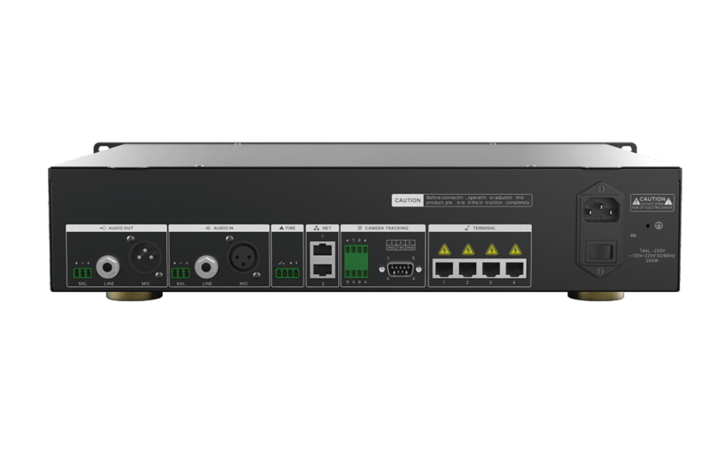 • Сервер имеет 4 интерфейса подключения конференц-пультов с питанием 24 В и поддерживает соединение в последовательную цепочку, «звездой» и смешанное подключение. Поломка одного пульта или кабеля не влияет на систему, обеспечивая стабильность.