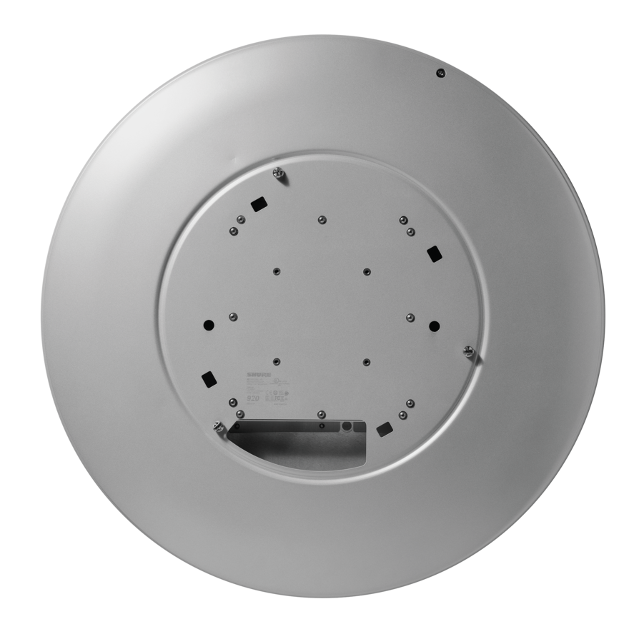 Shure MXA920W-R – круглый потолочный микрофонный массив, с системой автоматической настройки покрытия Automatic Coverage, оснащён многоцветной светодиодной индикацией, кабель может быть спрятан в кронштейн потолочного крепления, один разъем для питания, передачи аудио и управления - RJ45, цвет микрофонного массива – белый.