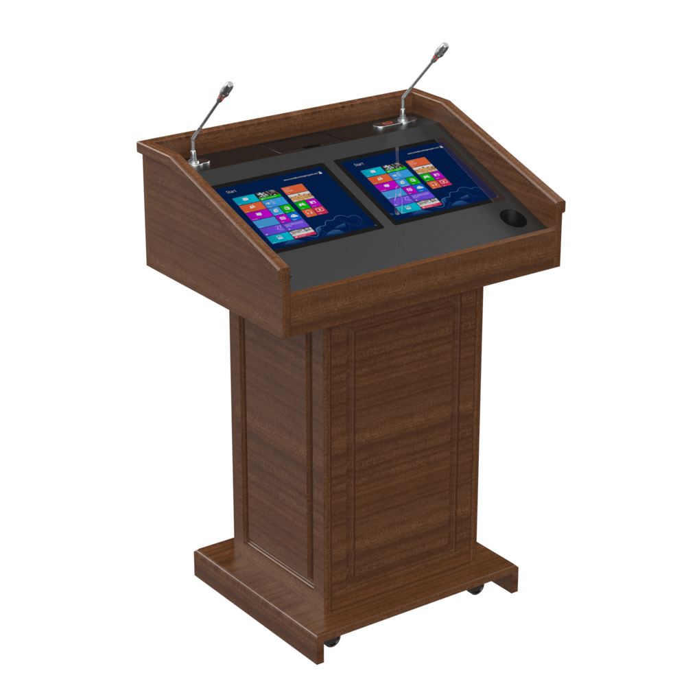 В каталоге представлен широкий ассортимент подиумов и трибун для выступлений, различающихся не только цветом, размерами и наличием рэковых стоек, но и функциональностью. Условно их можно поделить на мобильные (передвижные) и стационарные. Кроме того, каждая модель имеет свой набор дополнительных возможностей. К примеру, стандартная комплектация может включать различные полки, выдвижные ящики и отделения для установки периферийного оборудования и компьютеров. В качестве опции, возможна установка дополнительных кронштейнов для мониторов и камер. Многофункциональные мультимедийные трибуны по умолчанию комплектуются полками под клавиатуру и мышь, боковыми выдвижными ящиками для хранения проекторов и документ-камер различных производителей. Передвижные трибуны снабжены удобными, надежными и мягкими колесными системами. В некоторых моделях реализована возможность двухстороннего доступа к внутреннему пространству для удобства обслуживания оборудования и подключения/отключения кабелей. Кафедры и трибуны оснащаются внешними и потайными замками для обеспечения безопасности и надежного хранения размещенного внутри оборудования. Проводка аудио-видео и компьютерных кабелей во внутреннем пространстве подиумов производится через специальные отверстия в стенках и перегородках и далее - по внутренним кабельным каналам. В случаях, если предполагается использование во время выступления большого количества электронного оборудования, по желанию клиента, на столешнице могут устанавливаться колодки розеток питания и панели с компьютерными разъемами. Таким образом, создаются оптимальные условия для быстрого подключения ноутбука, проигрывателя или flash-карты с материалами готовящейся презентации. С той же целью трибуна докладчика дополнительно может быть оборудована микрофоном на гибком кронштейне, системой настольного света и часами с таймером, чтоб контролировать оставшееся время доклада.