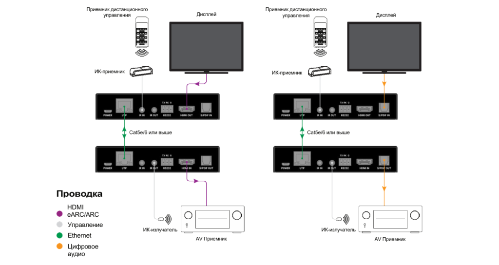 Двунаправленная передача сигналов ИК, RS-232 и CEC позволяет управлять системой с любой стороны. Эта функция обеспечивает полную интеграцию с экосистемой помещения.