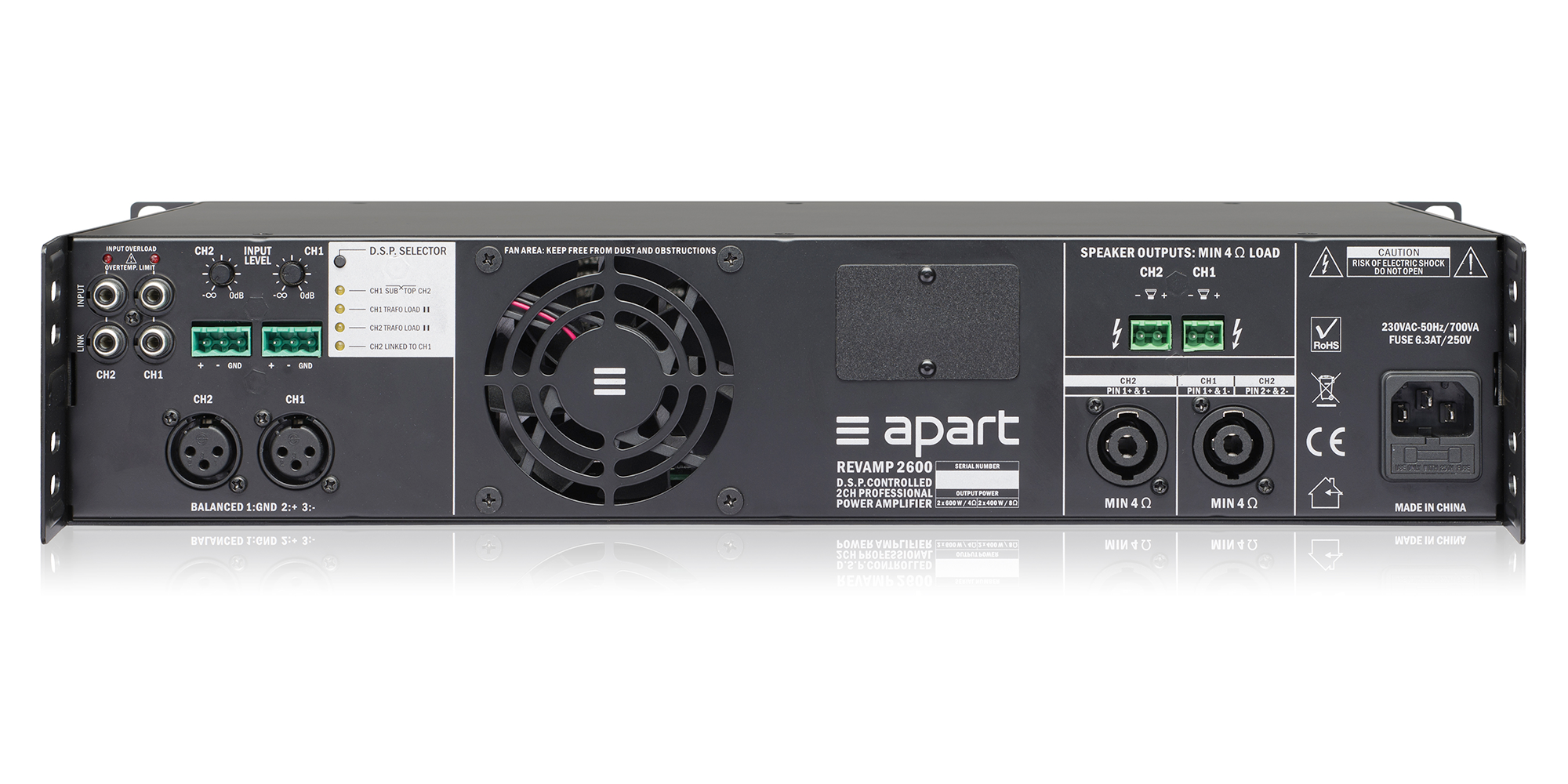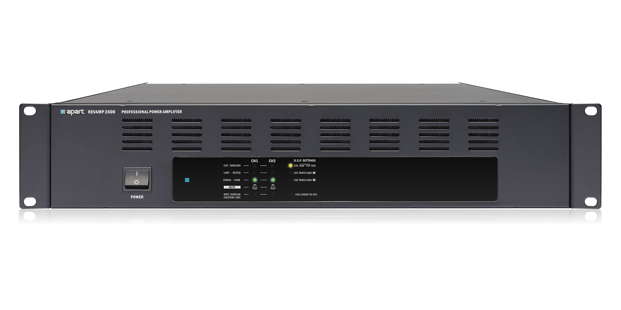 Apart REVAMP2600 профессиональный 2-канальный цифровой усилитель мощности 2 х 600 Вт 4 Ом, усилитель имеет импульсный SMPS блок питания, вентилятор с переменной скоростью Выходные каскады усилителя класса Н.