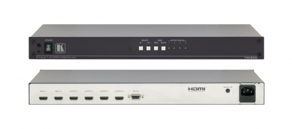 VM-24H — усилитель-распределитель для сигнала HDMI. Он выполняет компенсацию потерь в кабеле и перетактирование сигналов, поступающих на два входа, и выдает сигнал с одного из них по выбору на четыре одинаковых выхода.