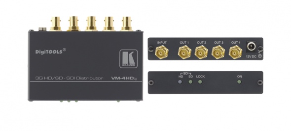 VM-4HDxl — высококачественный усилитель-распределитель сигналов SDI (SMPTE 259M и SMPTE 424M) и HD-SDI (SMPTE 292M). Прибор имеет один вход, сигнал с которого после буферизации и развязки распределяется на четыре идентичных выхода.